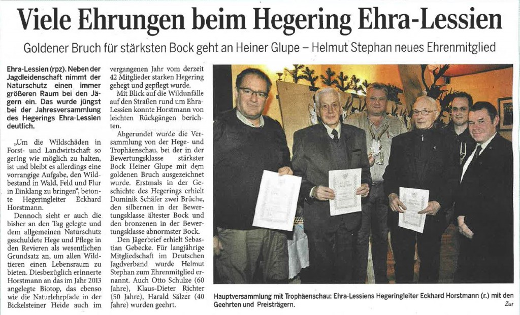 Ehrungen: Für 25 Jahre Mitgliedschaft wurden Klaus Schuster, Michael Voges und Harm Homann-Soest geehrt. Für 50 Jahre Mitgliedschaft wurden Hans Otto Ahrens, Adolf Behrens, Wilhelm Meier, Hermann Petersen und Hermann Raupers auf der Jahreshauptversammlung der Jägerschaft Gifhorn in Wesendorf geehrt. Dort wurden auch Dr. Gustav-Adolf Lange und Heinrich Wolf zu Ehrenmitgliedern ernannt.