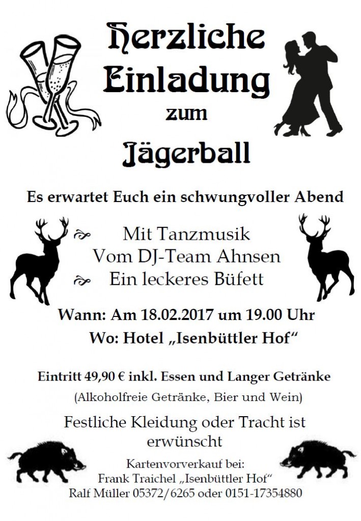 Es gibt noch Karten für den Gifhorner Jägerball am 18.02.2017 im Hotel „Isenbüttler Hof“. Interessierte melden sich schnell bei Frank Traichel im „Isenbüttler Hof“ oder bei Ralf Müller unter 05372 /6265 oder 0151-17354880.